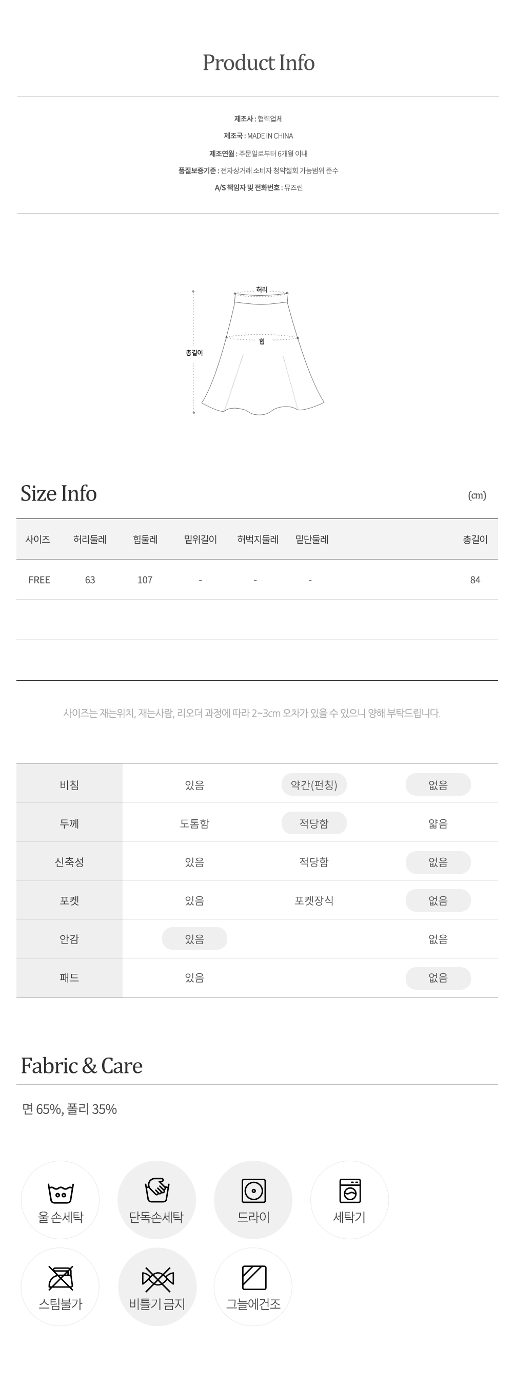 | 교환/반품 불가 | - 착용 또는 세탁한 상품 - 택/라벨 제거 상품 - 향수/화장품 등 냄새가 밴 상품 - 고객 부주의로 인한 훼손 상품 |