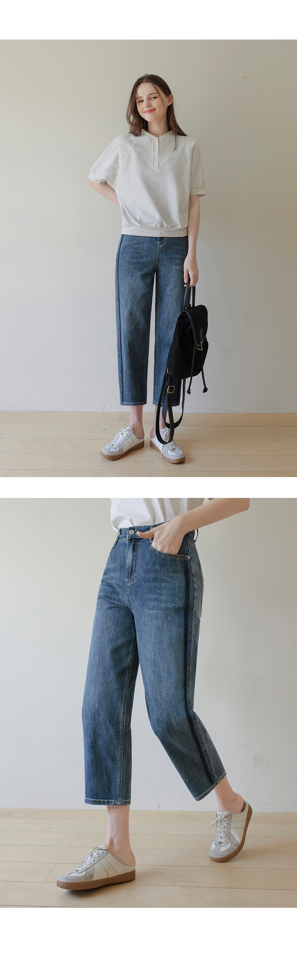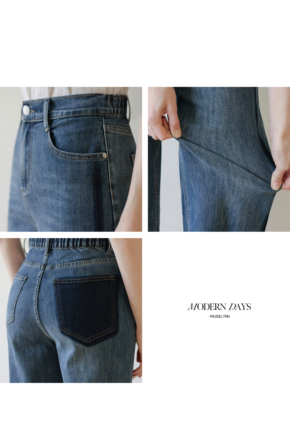[뮤즈린] 위시드 포켓 배색 배기핏 데님팬츠 [밴딩]