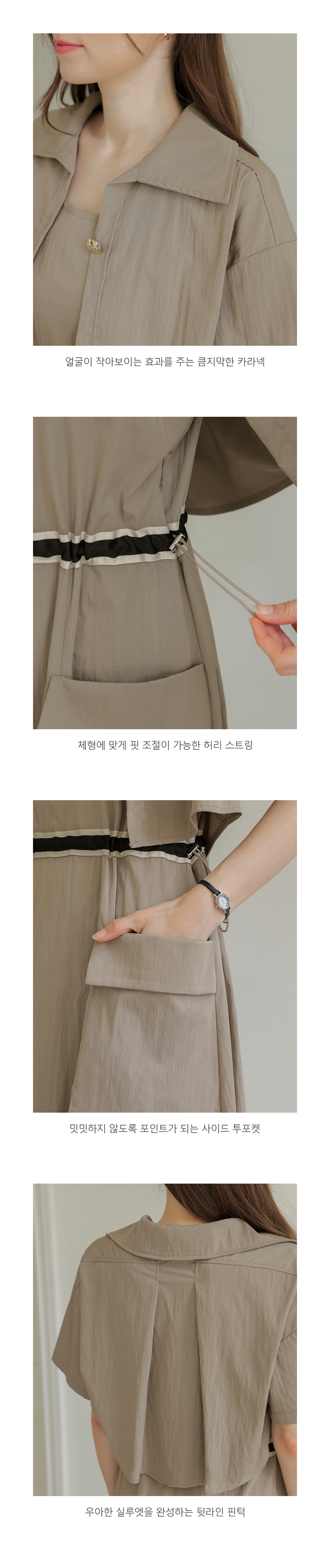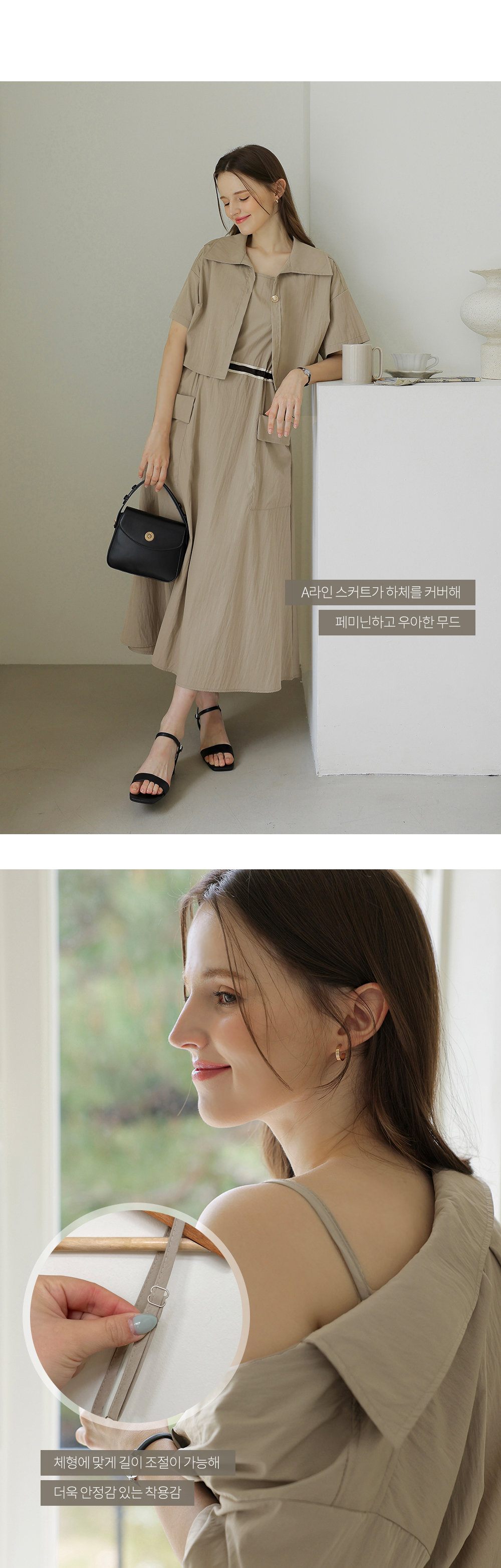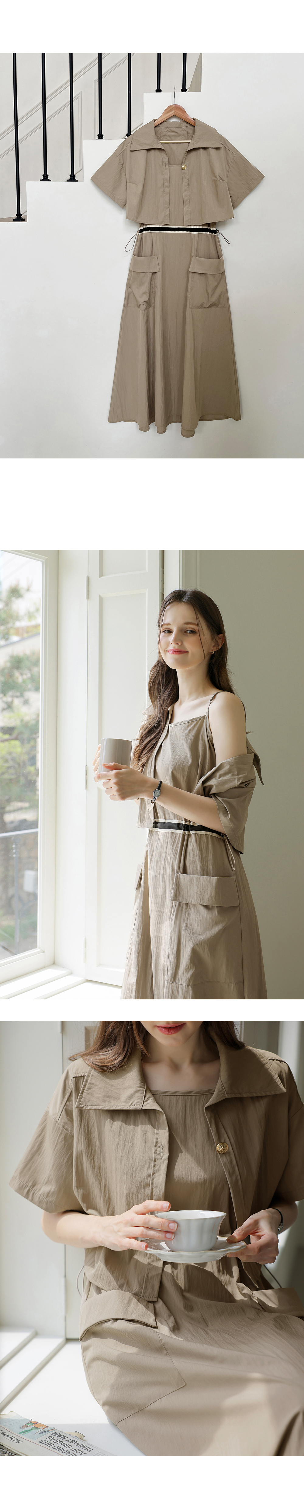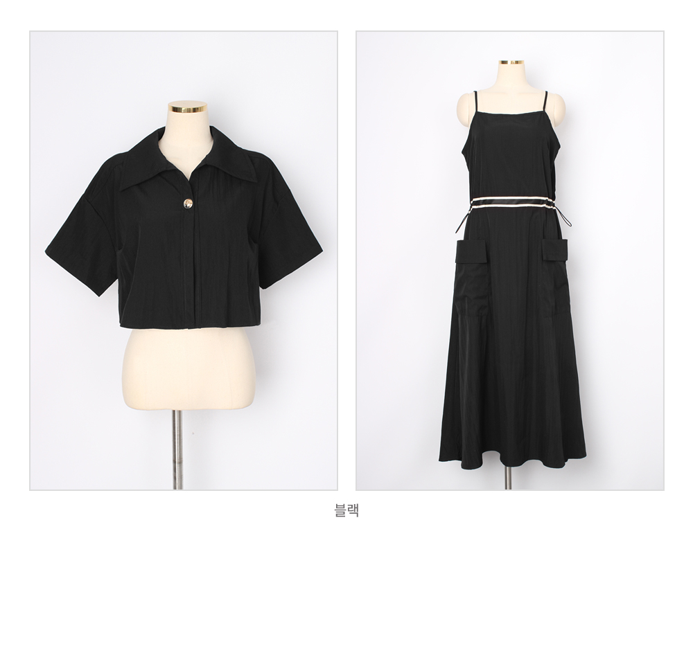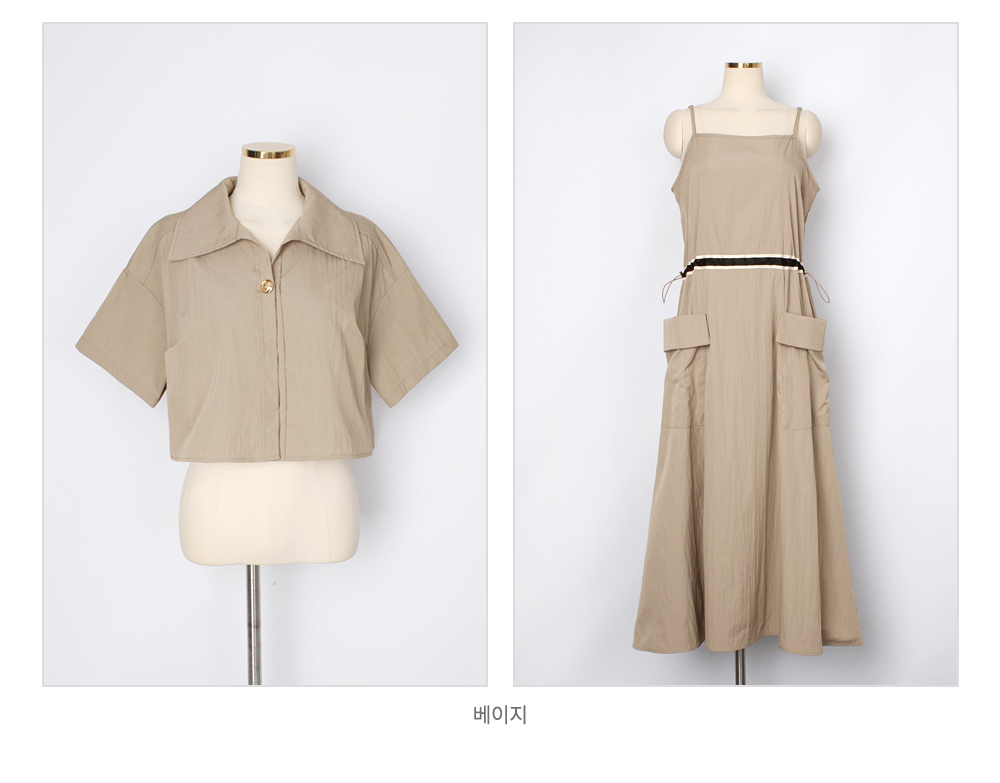 생각보다 구김이 많이 가는데 원단은 시원해요 사이즈는 88까지도 입을 수 있을거 같아요. 디자인 귀여워요. 어깨 스트링으로 길이 조절 가능한게 좋아요.