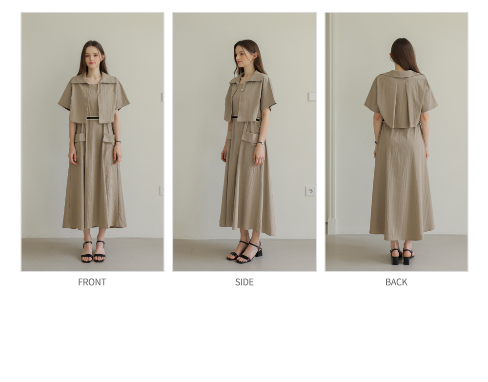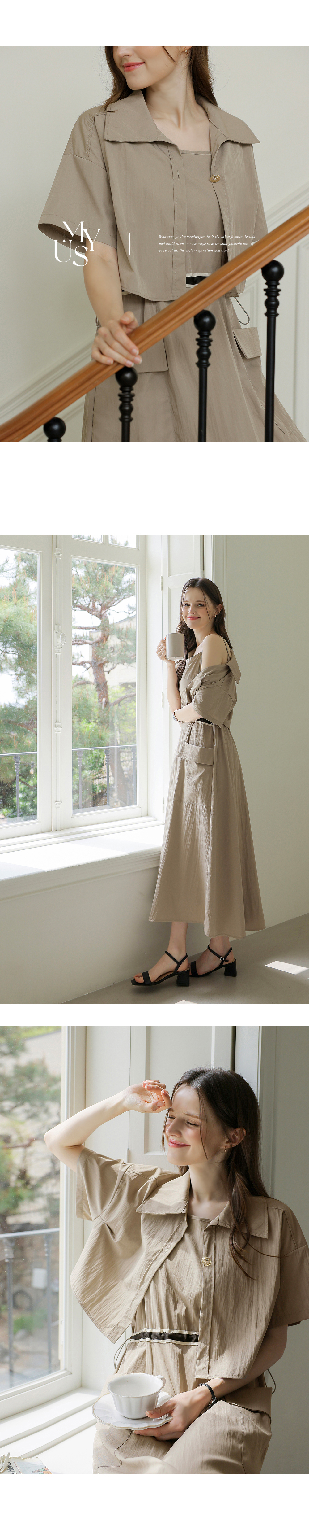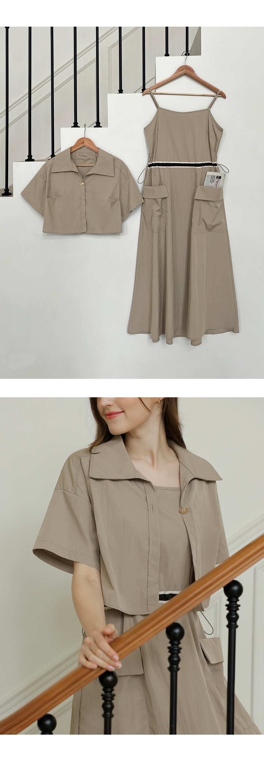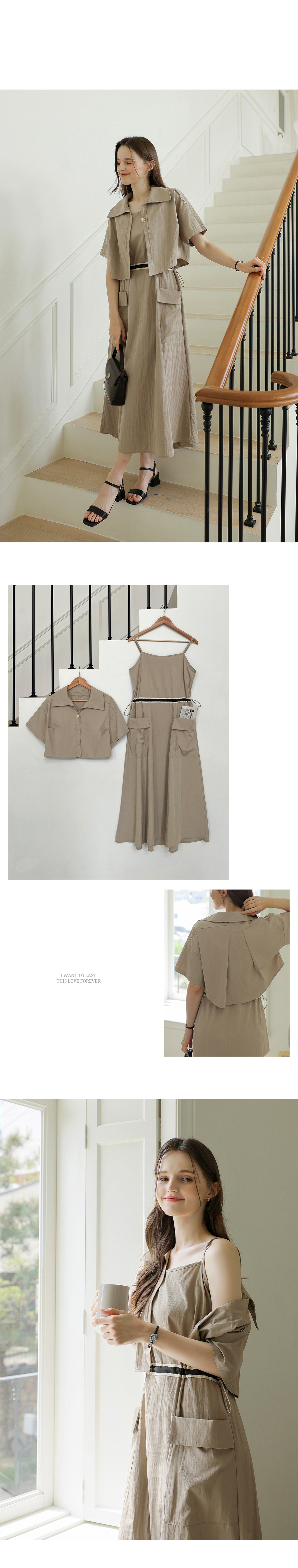 생각보다 구김이 많이 가는데 원단은 시원해요 사이즈는 88까지도 입을 수 있을거 같아요. 디자인 귀여워요. 어깨 스트링으로 길이 조절 가능한게 좋아요.