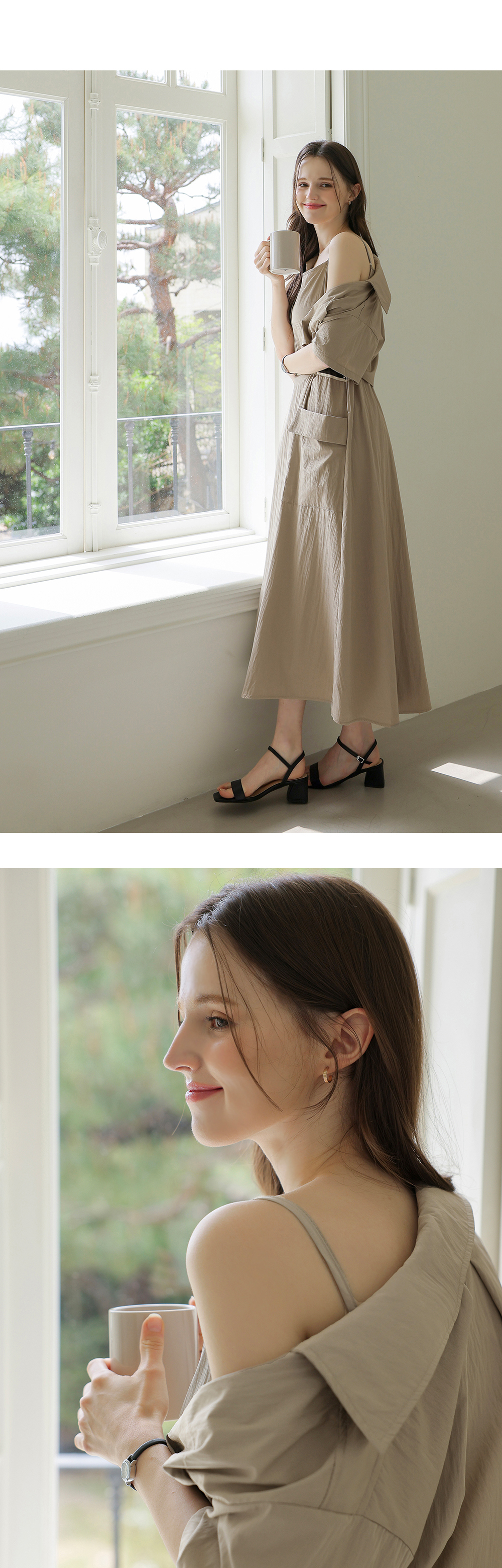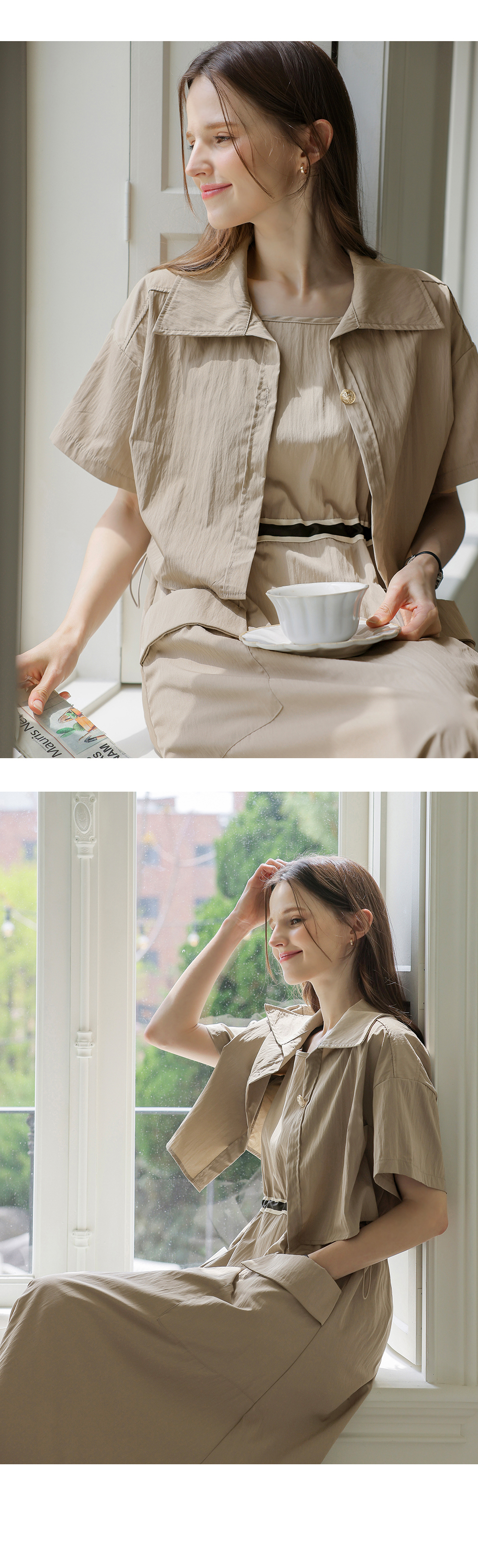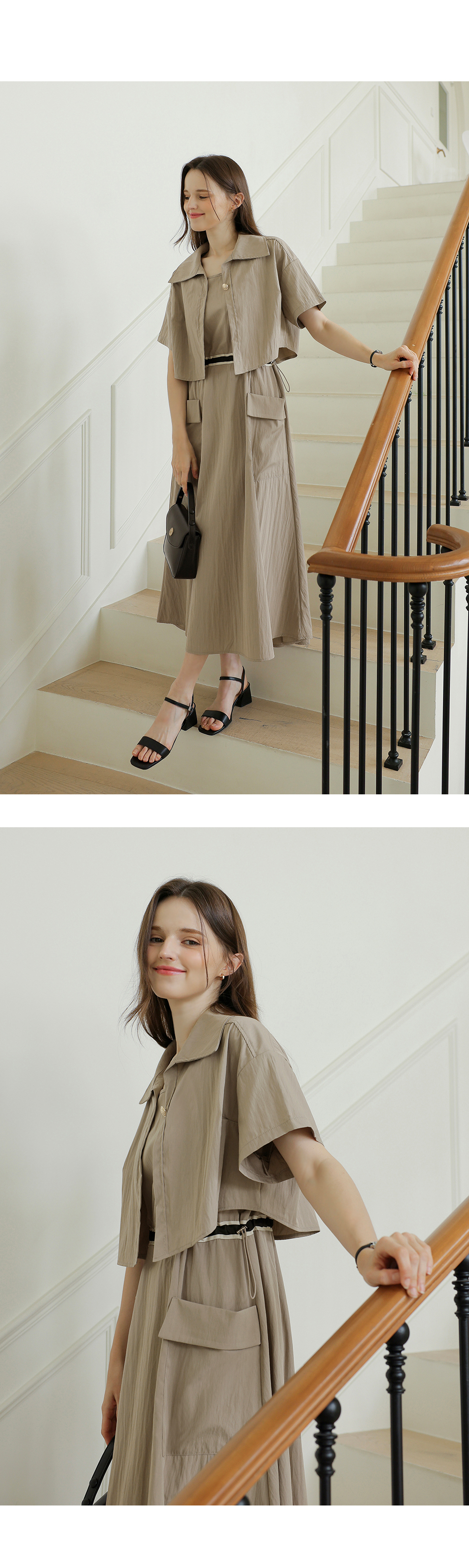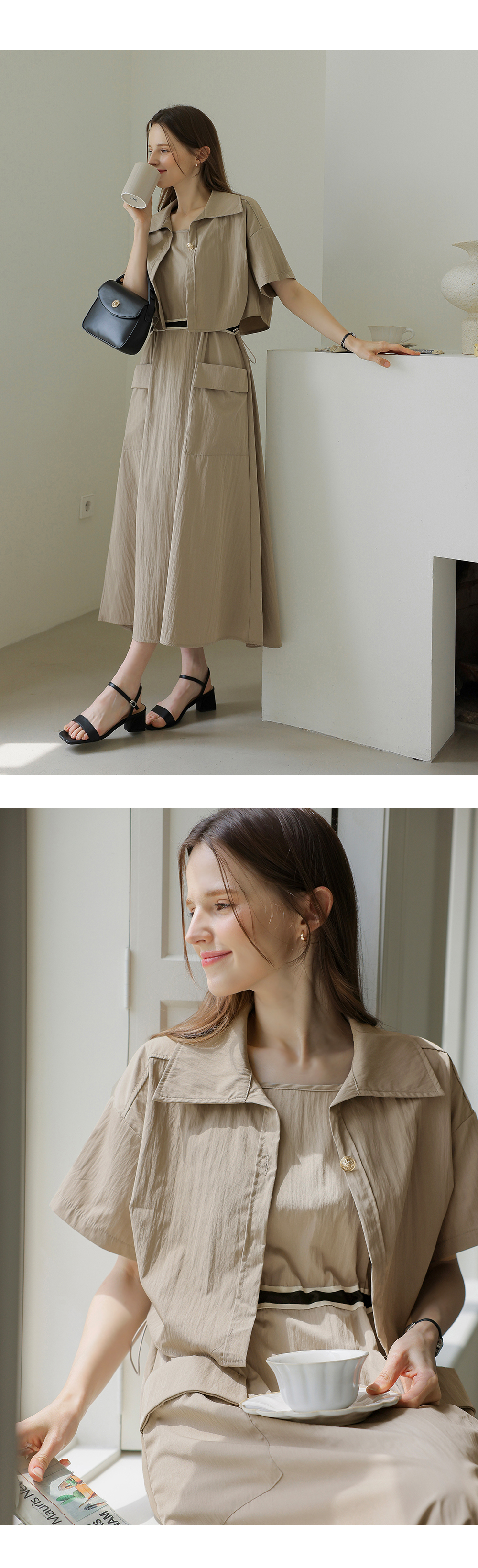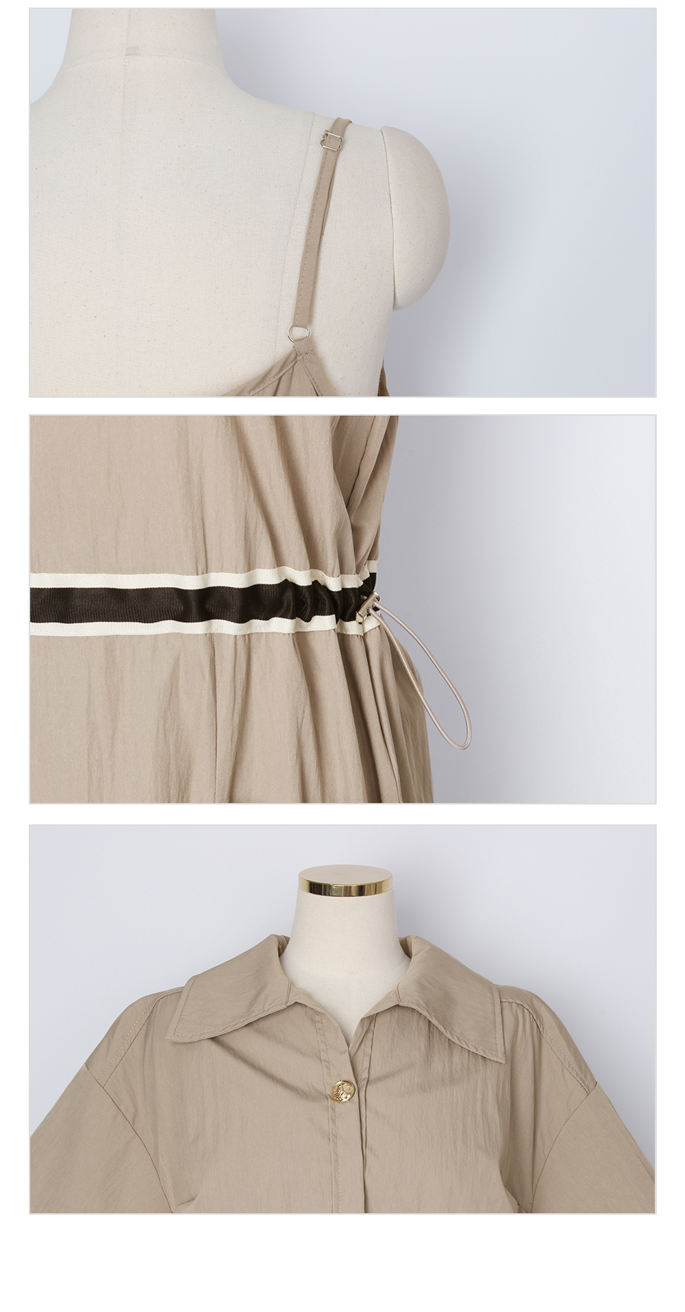 생각보다 구김이 많이 가는데 원단은 시원해요 사이즈는 88까지도 입을 수 있을거 같아요. 디자인 귀여워요. 어깨 스트링으로 길이 조절 가능한게 좋아요.