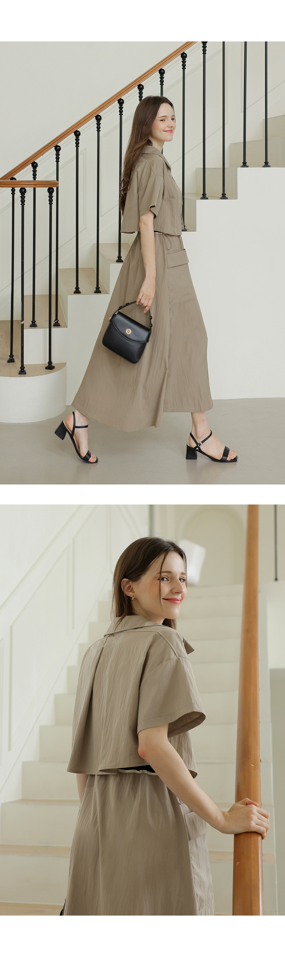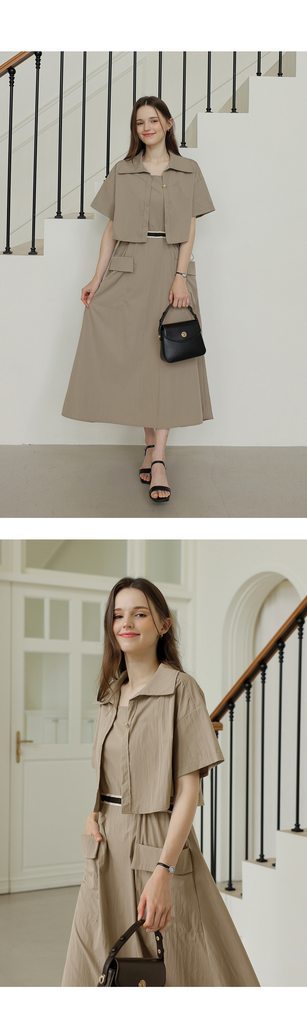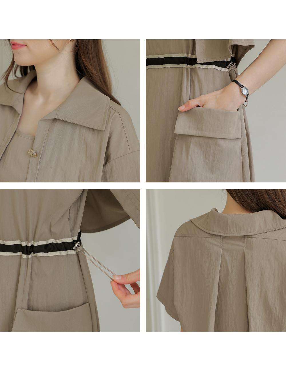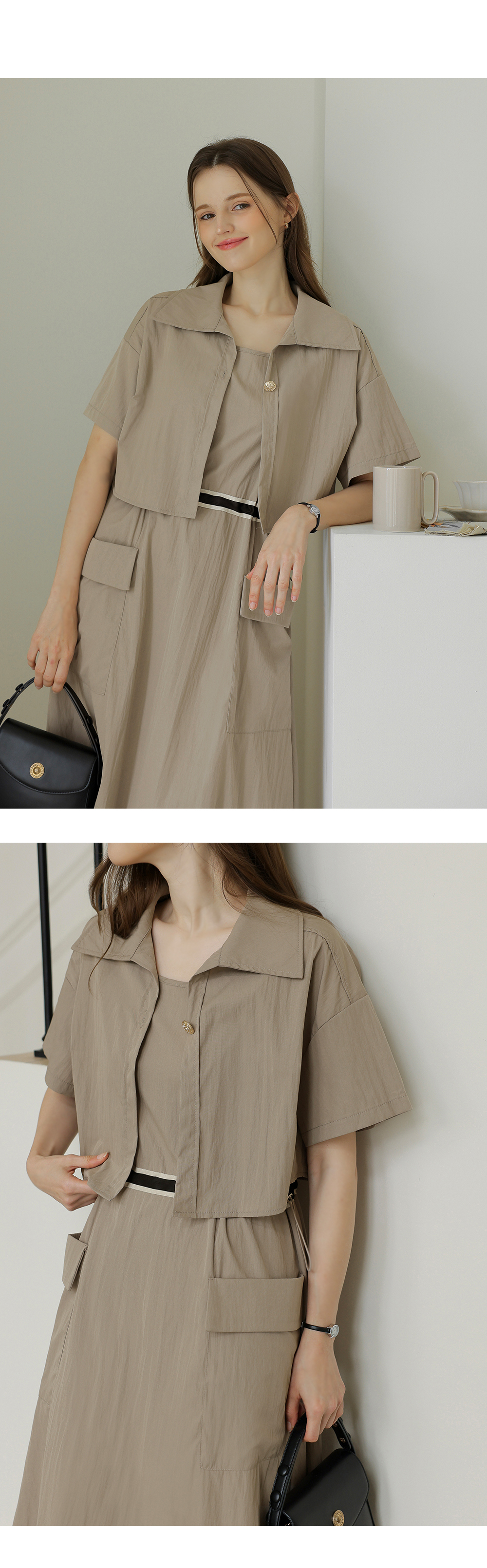 생각보다 구김이 많이 가는데 원단은 시원해요 사이즈는 88까지도 입을 수 있을거 같아요. 디자인 귀여워요. 어깨 스트링으로 길이 조절 가능한게 좋아요.