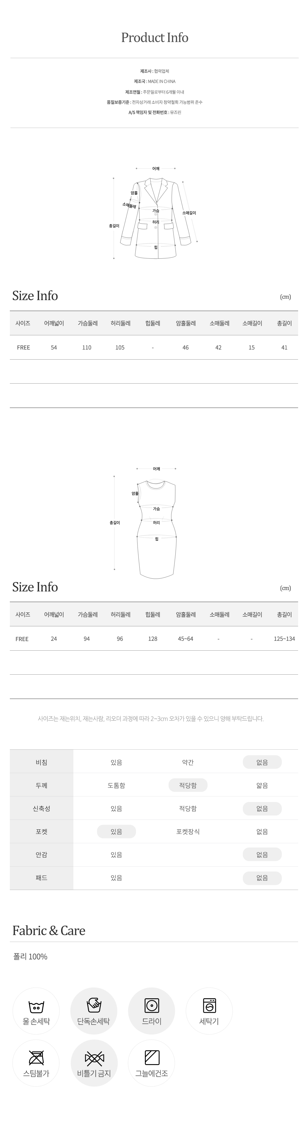 | 교환/반품 불가 | - 착용 또는 세탁한 상품 - 택/라벨 제거 상품 - 향수/화장품 등 냄새가 밴 상품 - 고객 부주의로 인한 훼손 상품 |