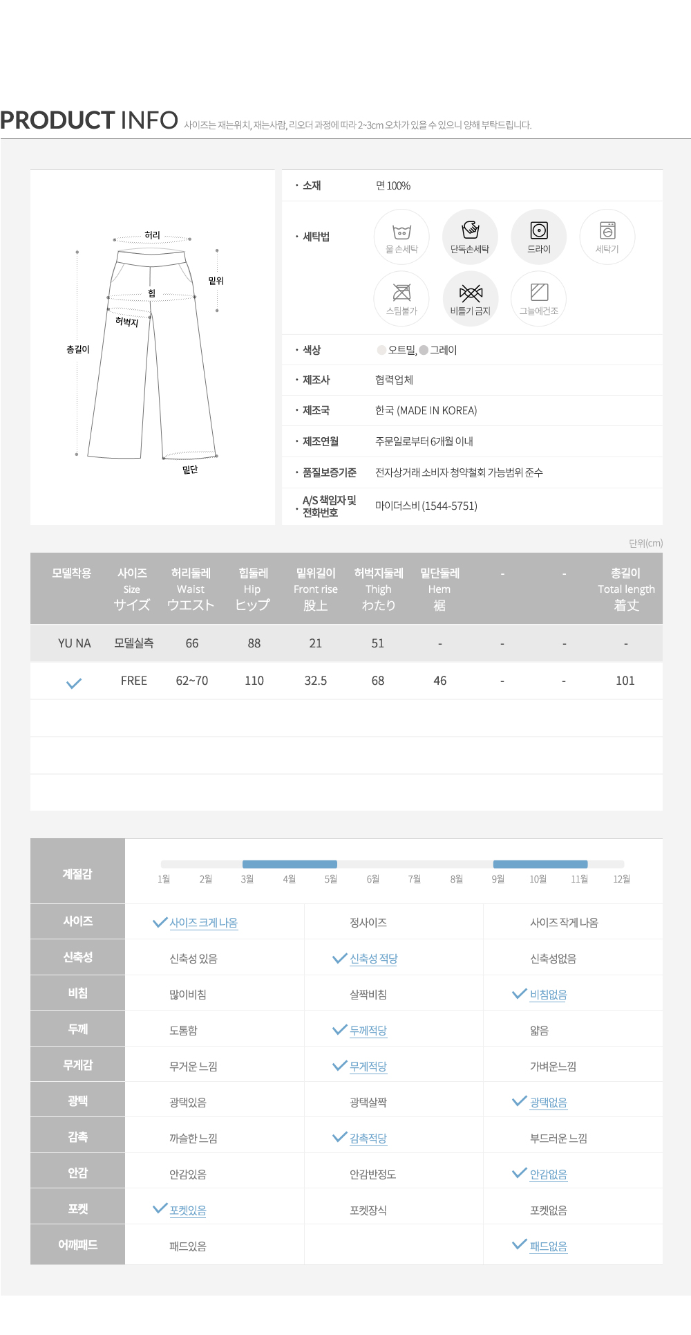 생각보다 도톰해서 가을 겨울까지 가능할듯 싶네요색깔은 화면처럼그리 밝진않네요~~바지통이 너무 넓지않을까 걱정햇는데 적당합니다~~그리 큰키가 아닌 160인데 길이는 그냥입어도 길지않습니다~