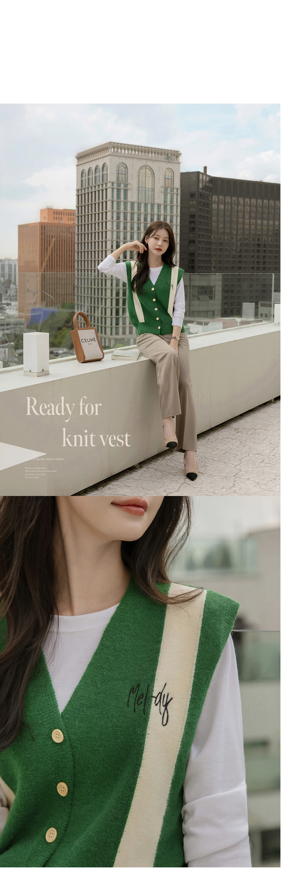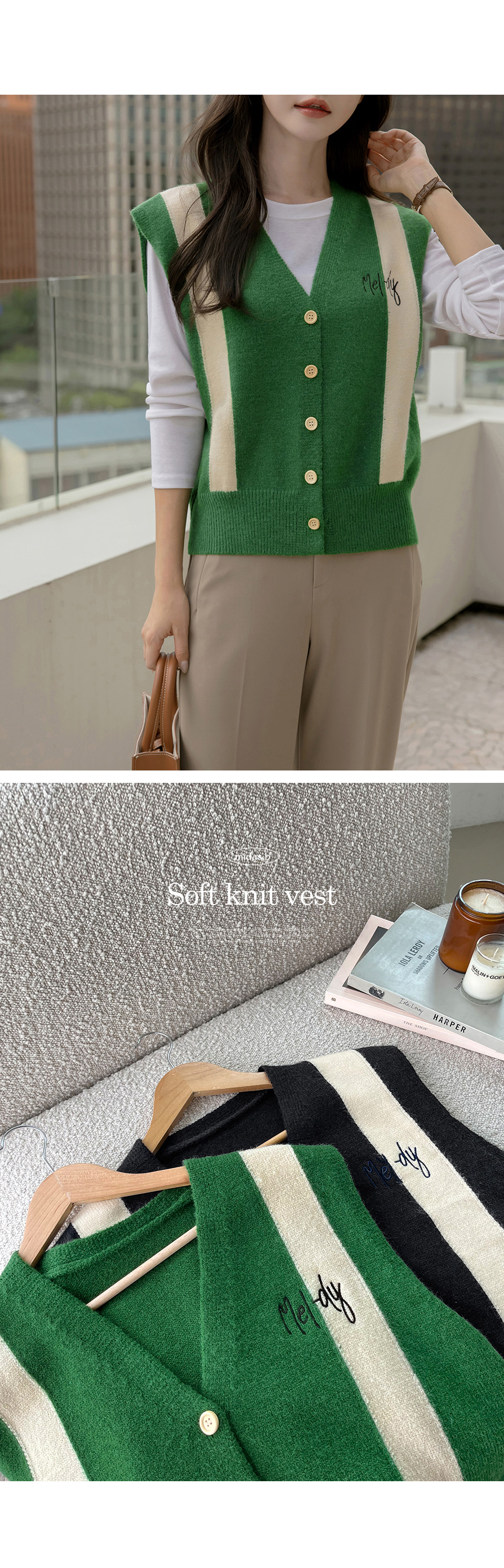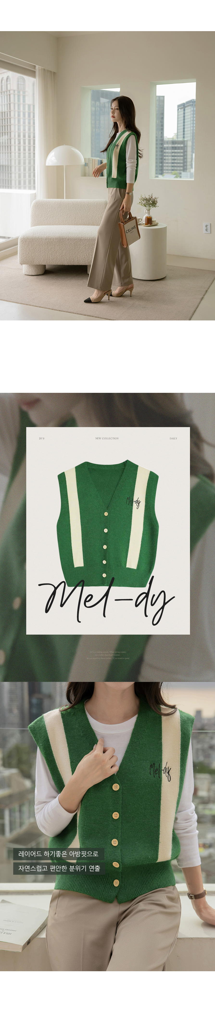 멜로디 자수 배색 니트 조끼